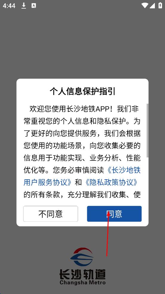 1、打开长沙地铁APP,弹出“个人信息保护指引”弹窗,阅读内容后点击“同意”,进入登录页面 。