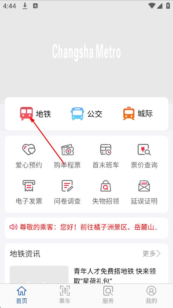 3、登录后进入首页,点击“地铁”选项,可使用爱心预约、购单程票等功能,规划地铁出行 。