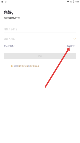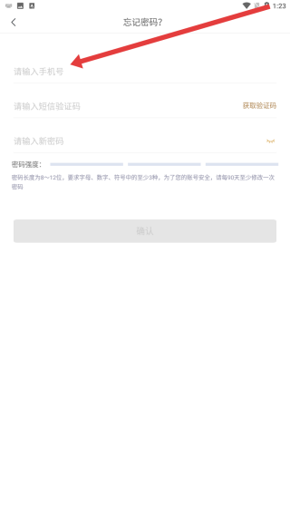 3、忘记密码页面,在请输入手机号输入框填写号码,推进密码重置步骤。