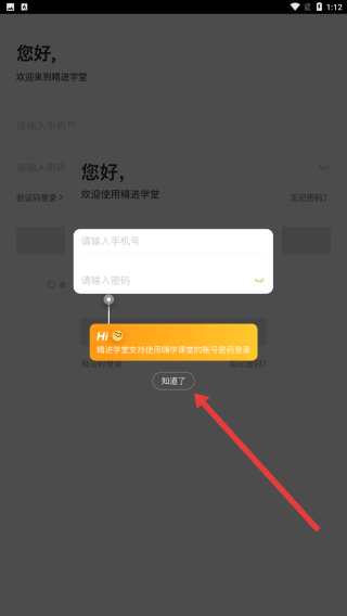 1、登录界面弹出提示弹窗,点击知道了关闭提示,继续账号登录相关操作。