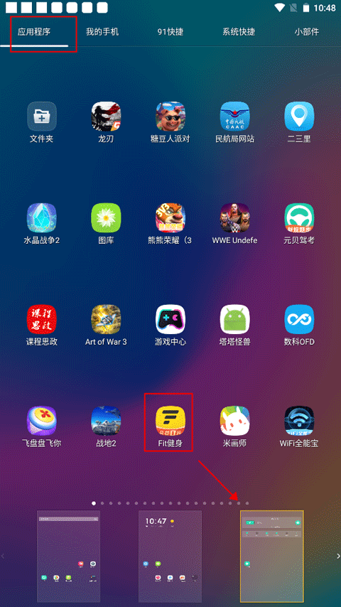 2、你可以添加应用程序图标、我的手机、91快捷等,只要选中图标移动到相对应的屏幕上就可以了。