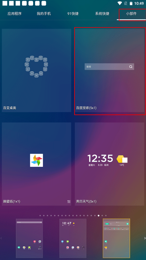3、除了可以添加图标外,还可以添加小部件,就是选中你要添加的小部件之后,再点击你要添加的屏幕主界面即可。
