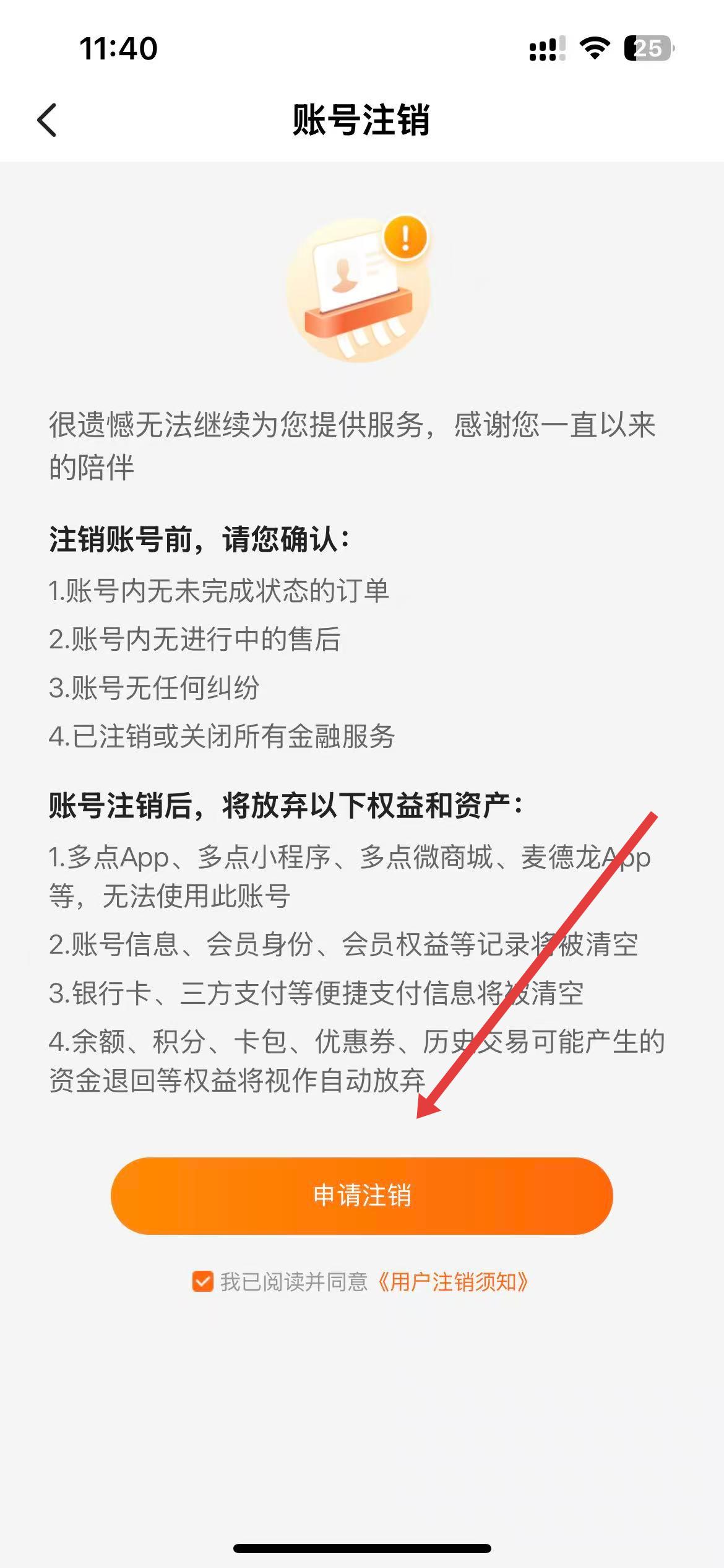 3、进入账号注销页面后,仔细阅读注销账号前的确认事项,确认无问题后,然后点击申请注销按钮,按照后续提示完成账号注销操作。