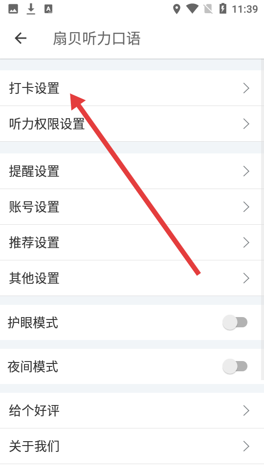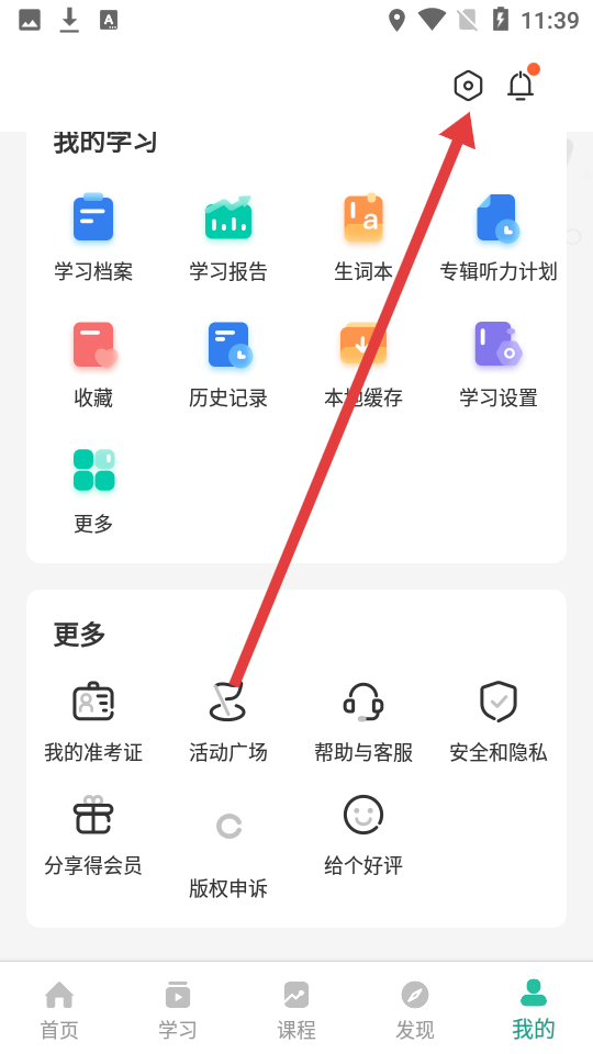 1、打开扇贝听力APP,点击底部导航栏我的,再点击右上角设置图标。