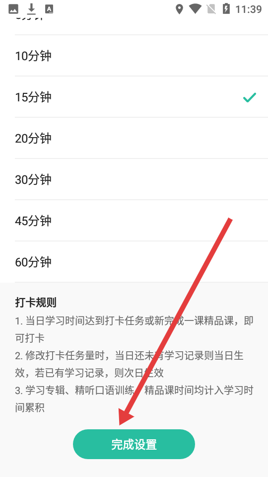 3、在打卡设置页面,选择想要的学习时长,点击完成设置确定打卡任务。