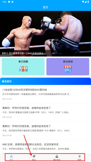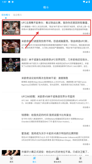 1、打开拳击APP,点击底部格斗,进入格斗资讯页面。