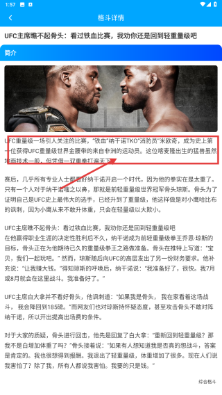 3、在格斗详情页,浏览UFC赛事动态、选手言论等资讯内容。