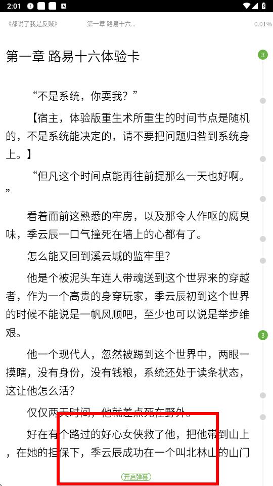 1、在欢乐书客小说阅读页面,点击屏幕中出现的开启弹幕按钮。