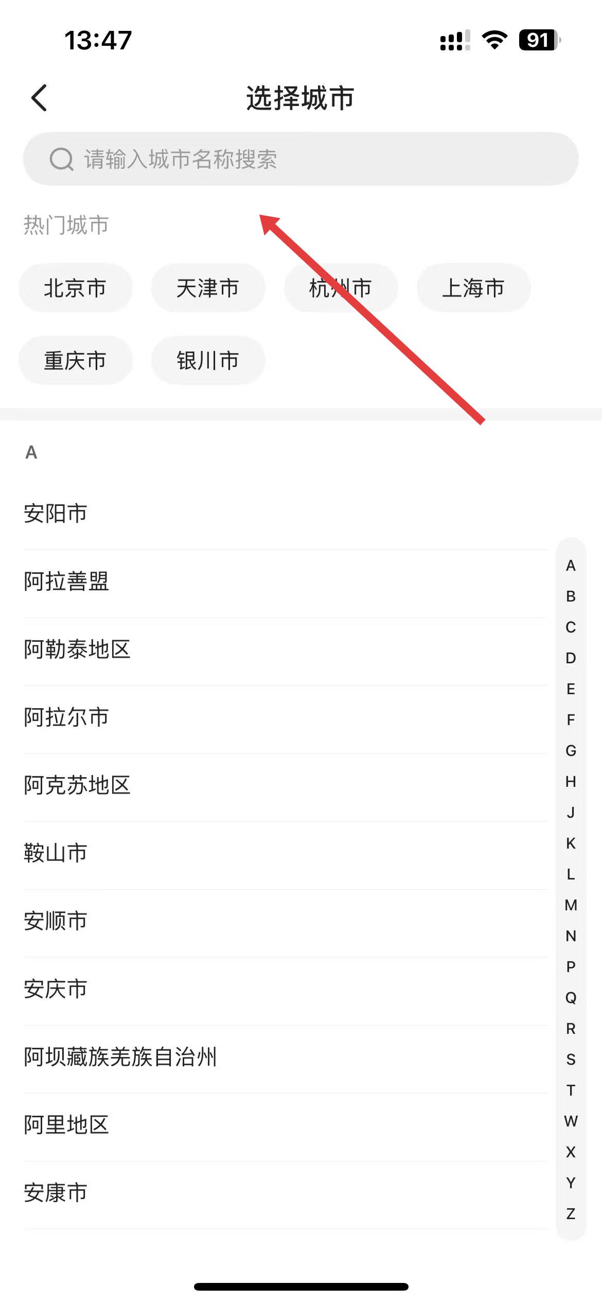 2、进入选择城市页面后,如果目标城市不在热门城市列表中,可以在搜索栏输入城市名称进行搜索定位城市。