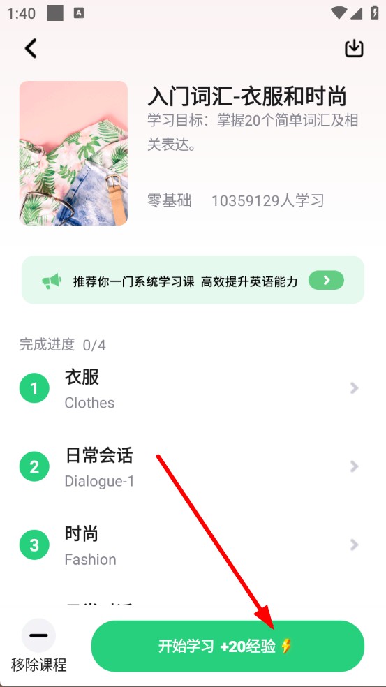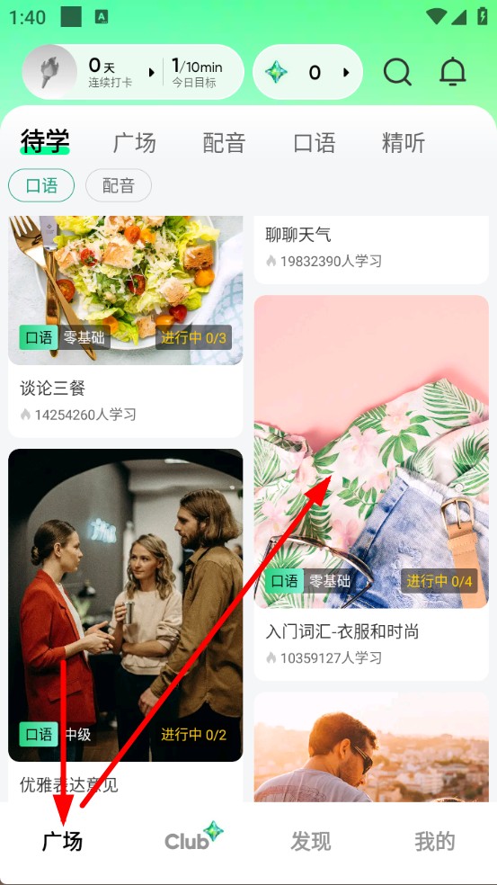 1、打开英语流利说APP,进入广场页面,选择想要学习的口语课程,如入门词汇-衣服和时尚。