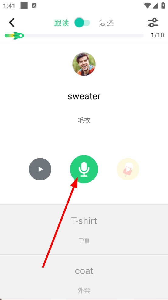 3、在学习界面中,开启跟读模式,点击麦克风图标,根据屏幕上出现的单词或句子进行跟读练习。