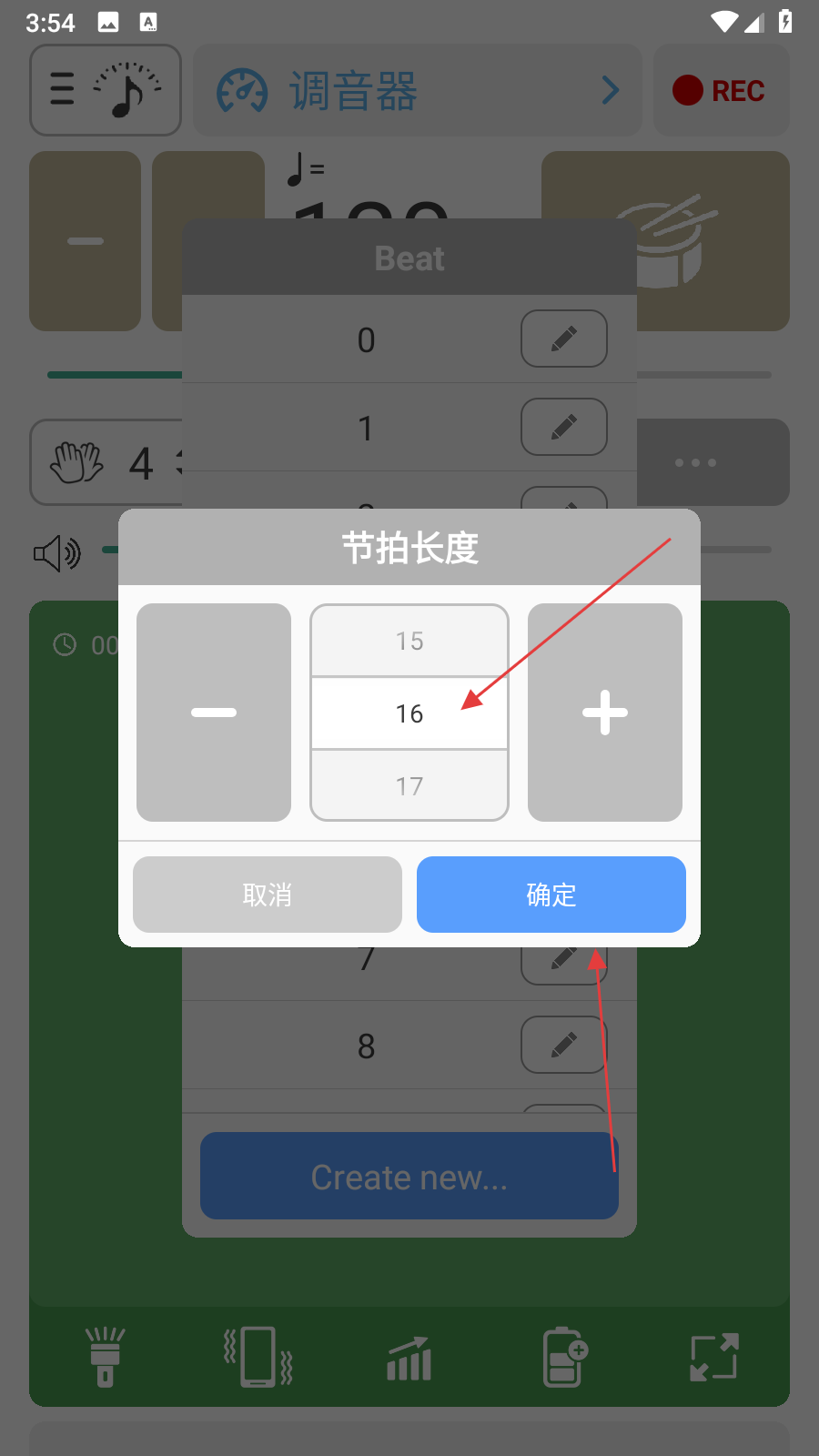 3、创建新节拍时会弹出节拍长度设置窗口,通过点击加减按钮或直接选择数字调整节拍长度,设置完成后点击确定按钮。