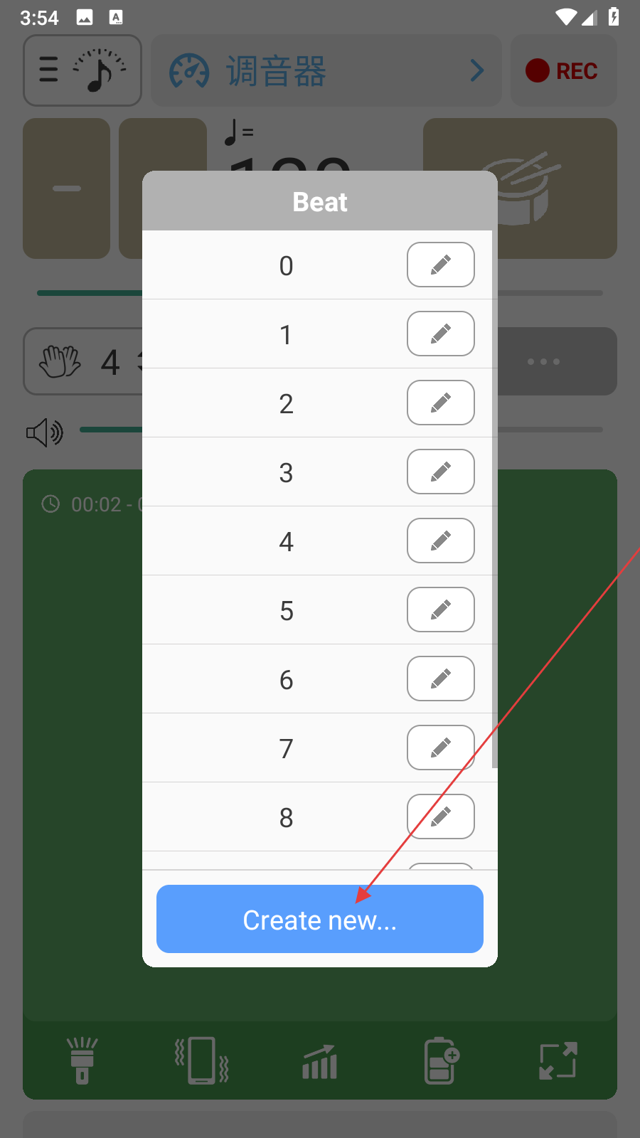 2、在点击手形图标后出现的选项中点击Create new按钮,这是创建新节拍模式的操作,点击后可根据自己需要定制独特节拍样式。
