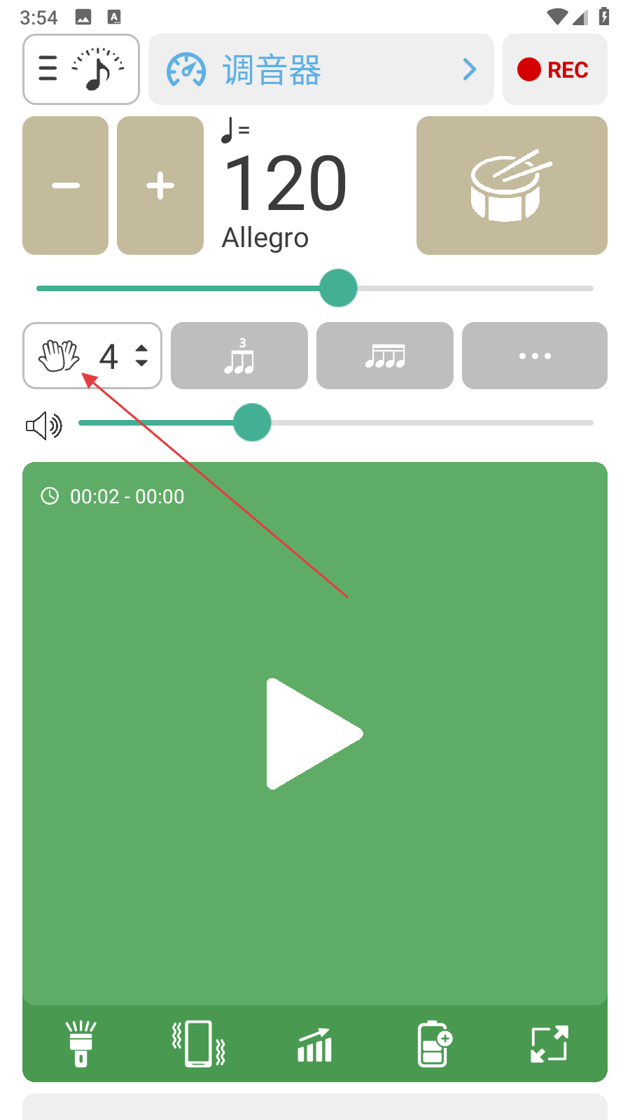 1、打开调音器和节拍器软件进入主界面点击类似手形图标,这是设置节拍相关功能入口,能对节拍进行设置满足演奏需求。