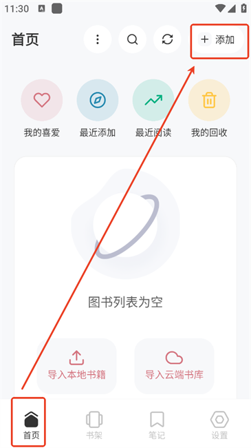 2.导入书籍时可以点击右上角的添加按钮,首次使用时首页中央区域会出现导入本地书籍按钮点击即可