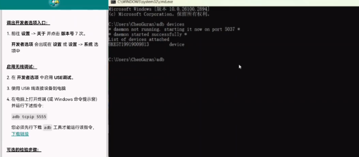 5、接着在电脑上输入adb tcpip 5555来启用无线ADB