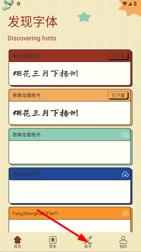 1、打开软件,点击底部练字,进入练字页面。