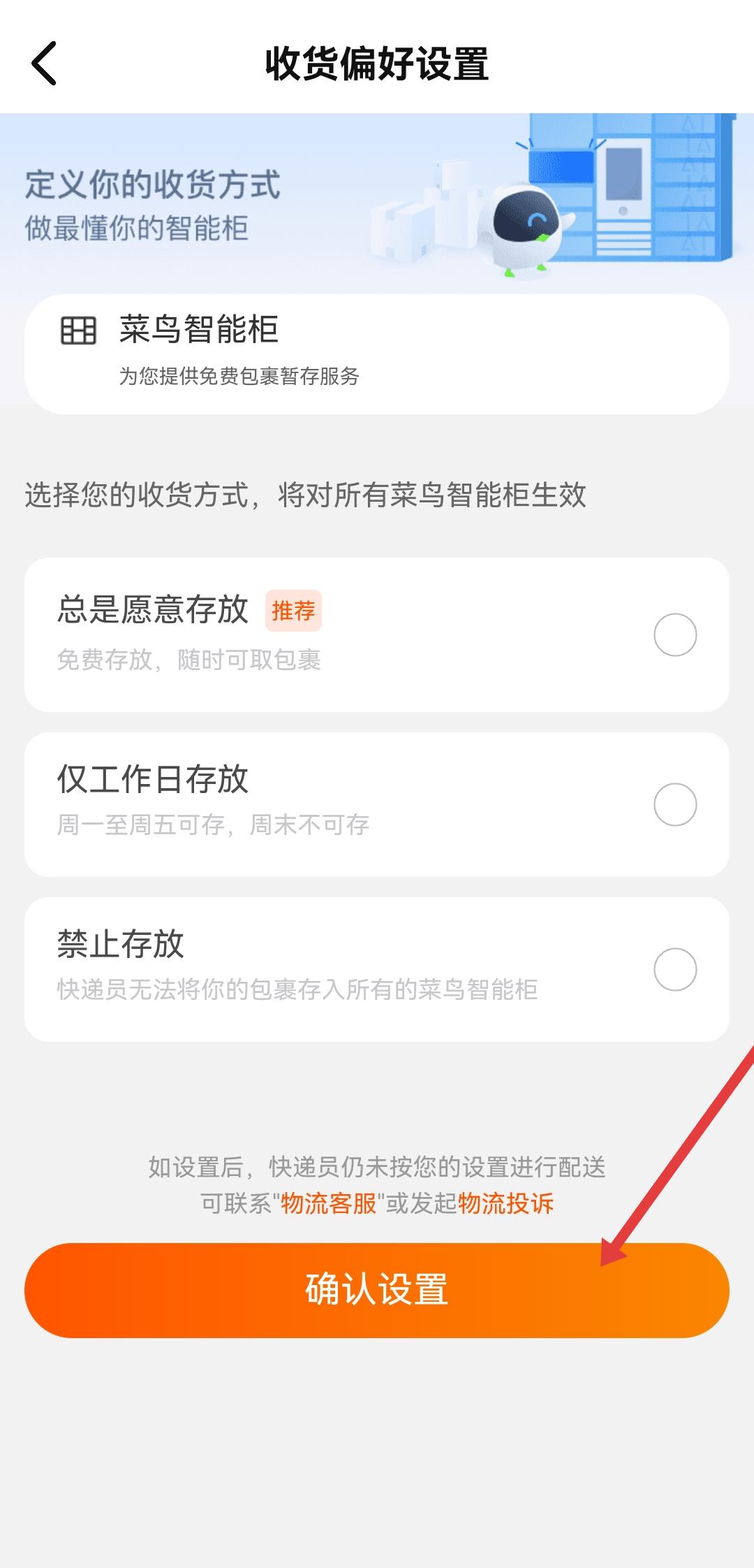 3、在收货偏好设置页面,选择对应的收货方式如总是愿意存放、仅工作日存放或禁止存放,选好后点击确认设置按钮。