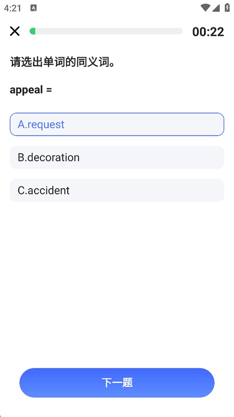 3、如果对背单词感到枯燥,点击首页的在线测评,系统出题检测提升水平;