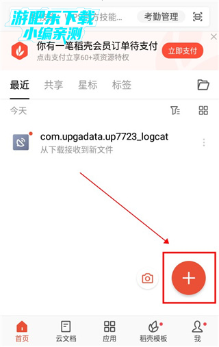 1、打开wps office app后,登录账号,在“首页”点击右下角的"+"按钮;