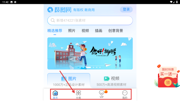 1、进入摄图网官网,点击底部分类,浏览素材分类页面。