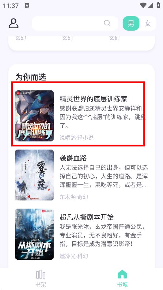1、在书城选择一本小说,如为你而选中的精灵世界的底层训练家并进入阅读界面。