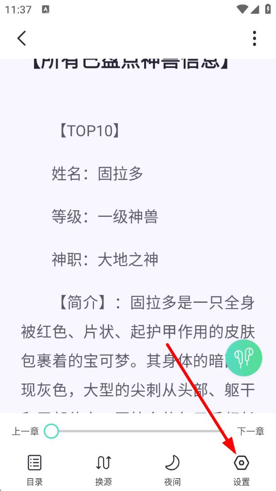 2、在小说阅读界面点击屏幕,出现底部菜单栏后,点击右下角设置图标。