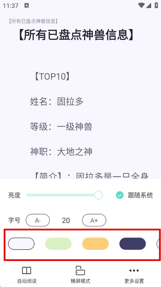 3、在设置界面中,找到背景颜色选项区域,点击不同颜色样式即可更换阅读背景。