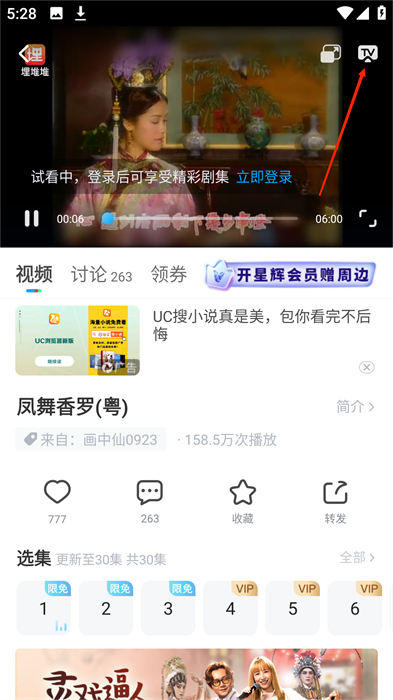 2、在剧集播放详情页点击右上角的“TV”按钮;