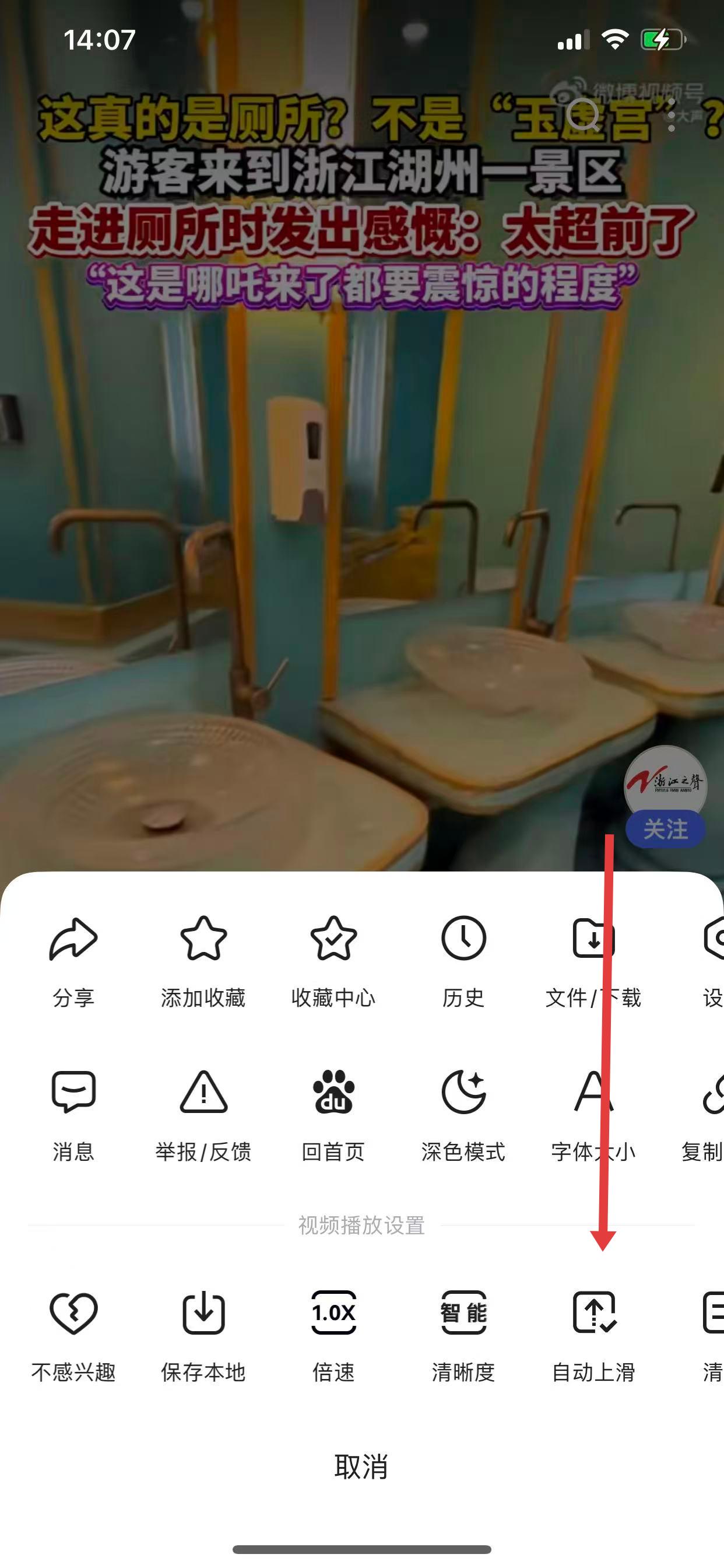 3、在弹出的操作菜单中,找到自动上滑选项,并点击开启。