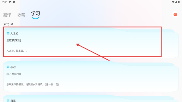 2、在学习页,选择目标诗词如人之初,进入诗词详情页。
