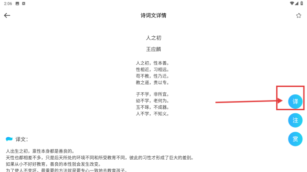 3、点击右侧译按钮,查看诗词的现代汉语译文,辅助理解。