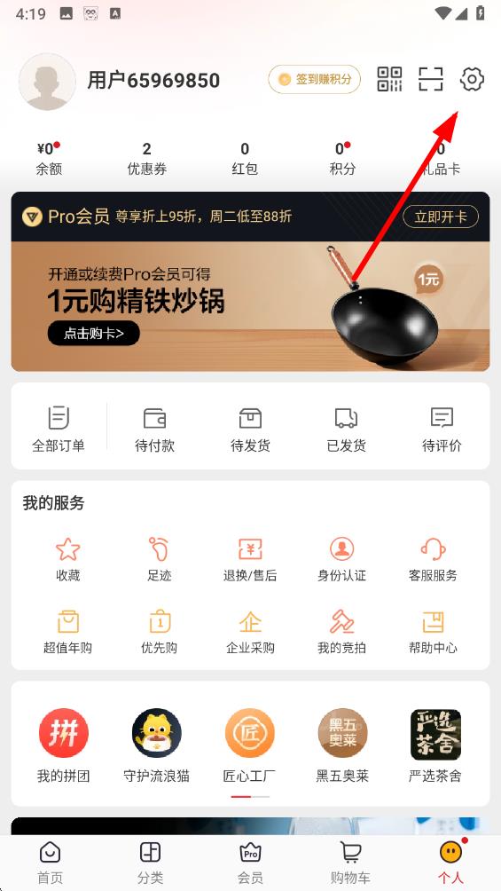 1、打开网易严选app,点击底部导航栏个人图标,进入个人相关界面,点击右上角设置图标。