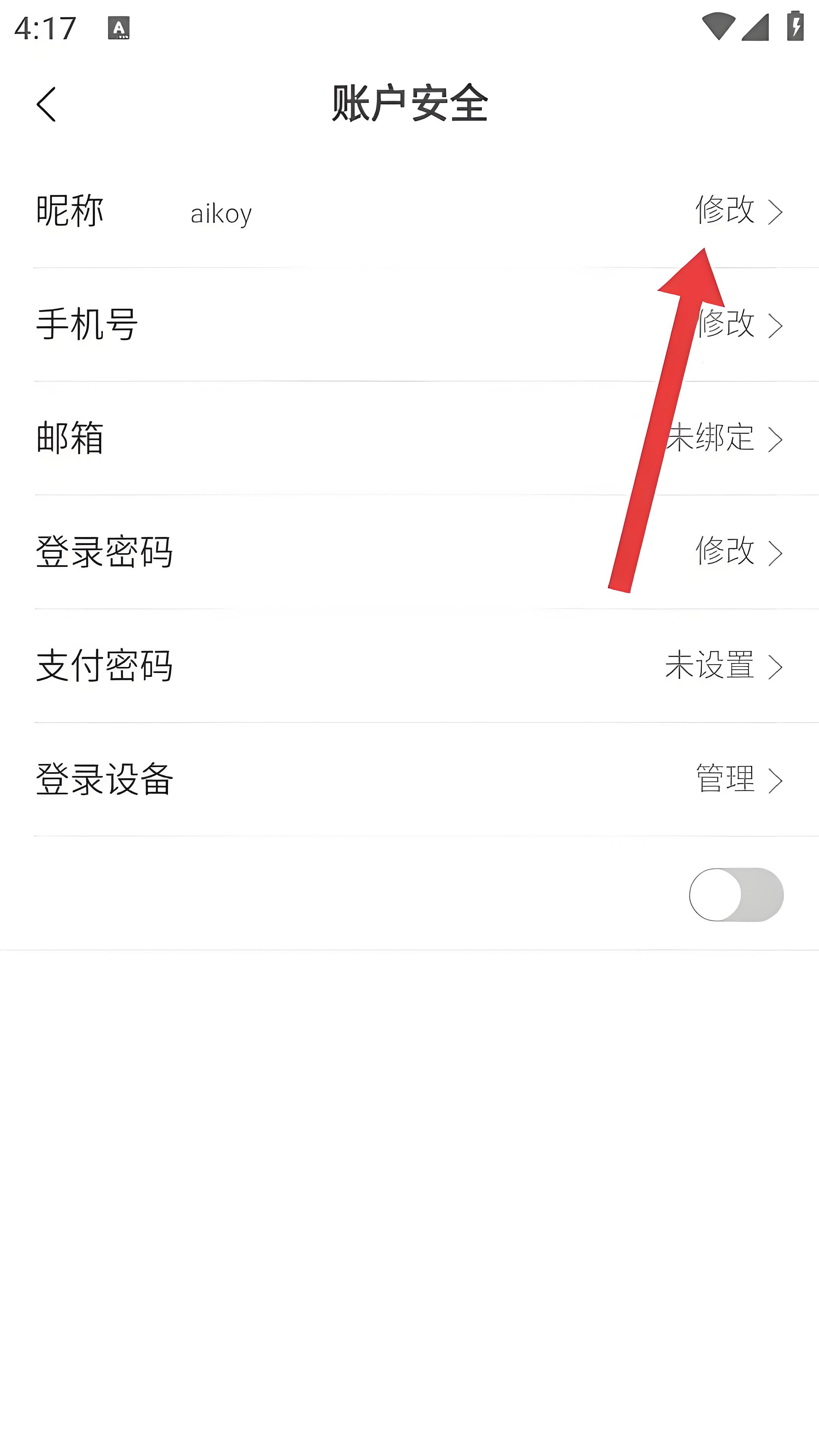 3、在账户安全的页面,点击昵称右侧的修改的按钮,就可以进入昵称修改界面进行修改昵称了。