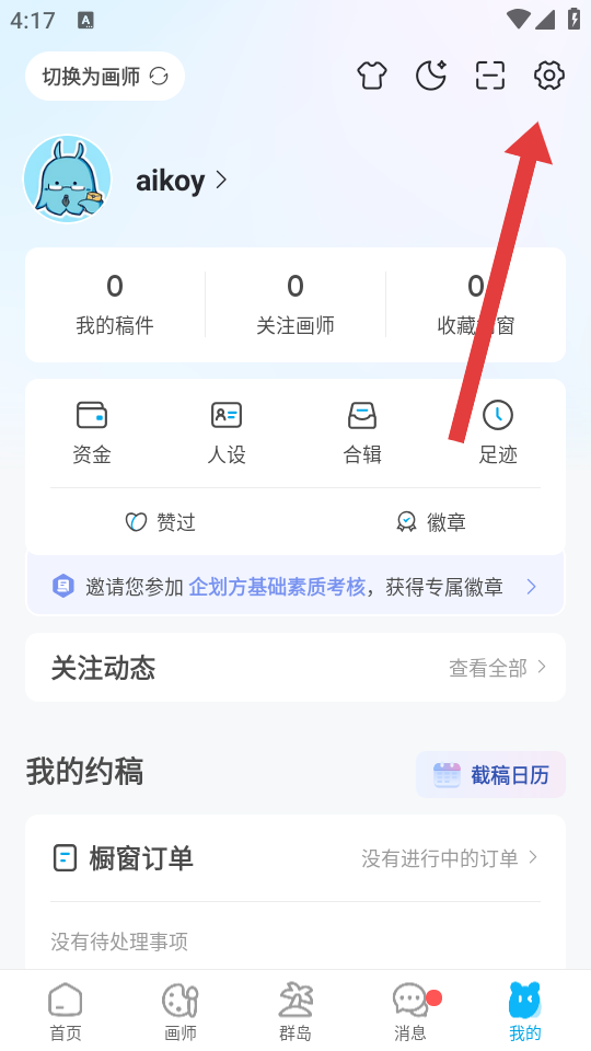 1、打开米画师APP,进入我的页面,点击右上角齿轮状设置图标,进入设置的界面。