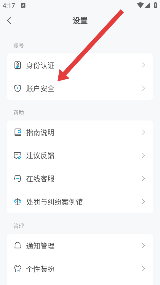 2、在设置的页面中,需要点击账户安全的选项,然后进入账户安全设置的页面。