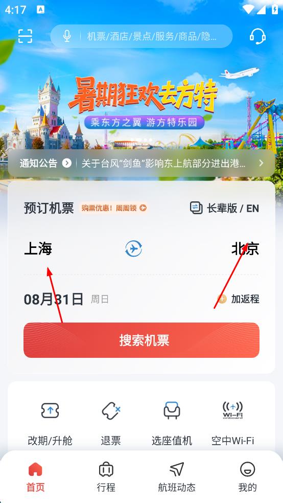 2、同样点击目的地“北京”,在城市选择页选定,设置出发日期为08月31日,点击搜索机票。