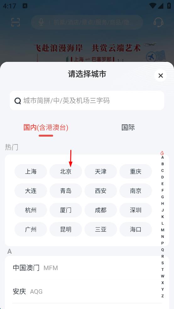 1、打开机票预订软件,在首页预订机票栏,点击出发地“上海”,进入城市选择页,确认出发城市。