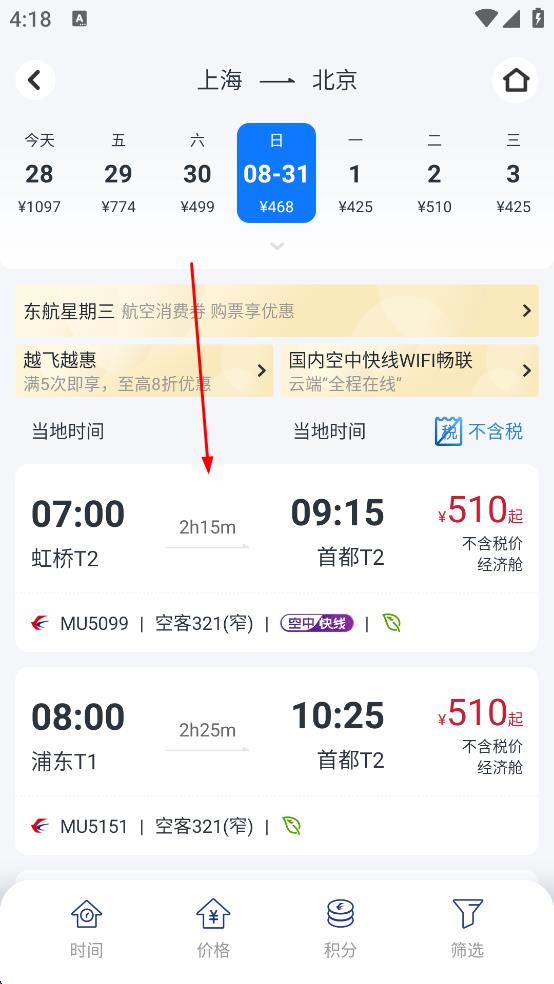 3、在搜索结果页,浏览航班信息,选择合适班次(如07:00虹桥T2→09:15首都T2),进行订票操作。
