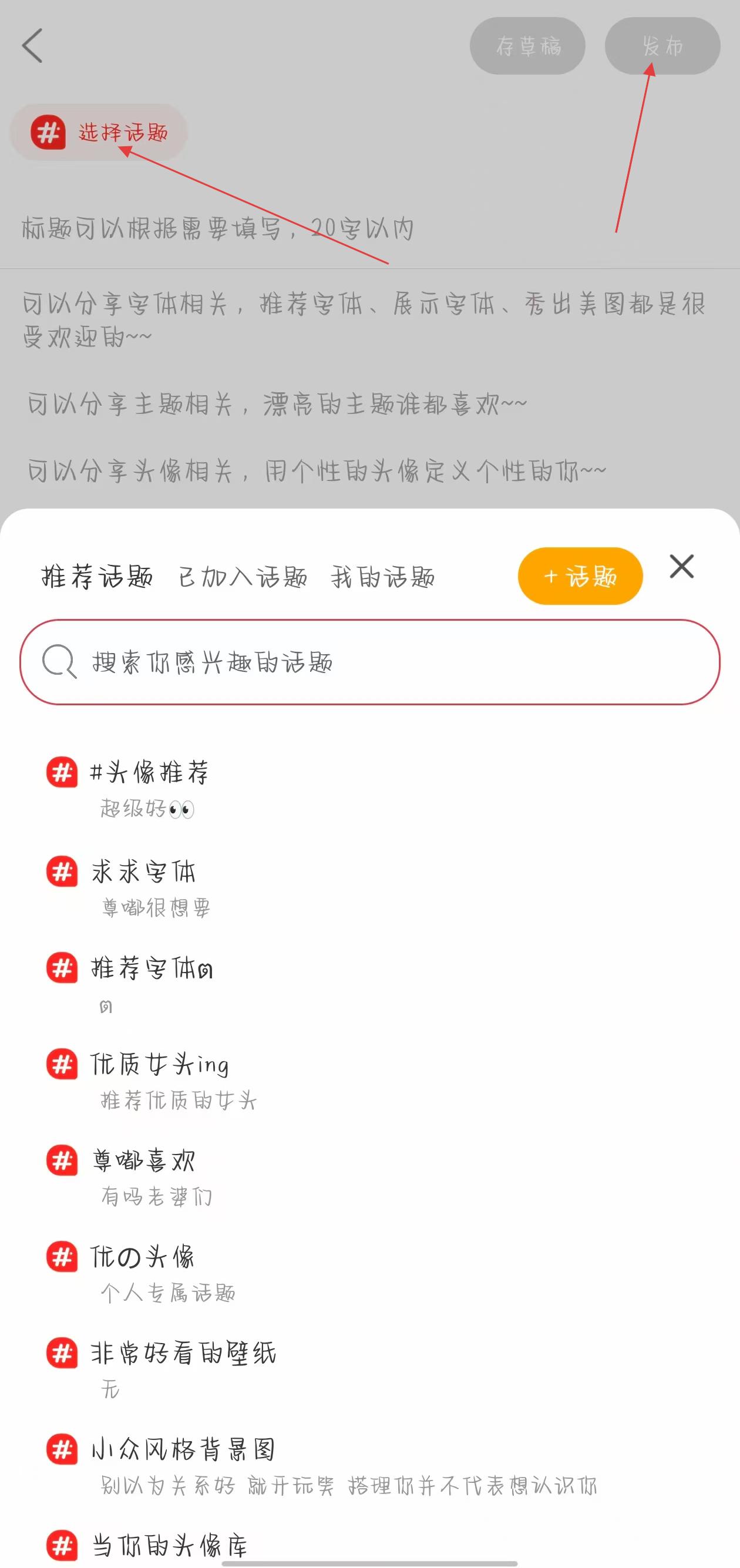 3、点击#选择话题,在弹出的话题列表中选择合适话题,完善隐私设置等信息后,点击右上角的发布按钮,即可成功发布动态。