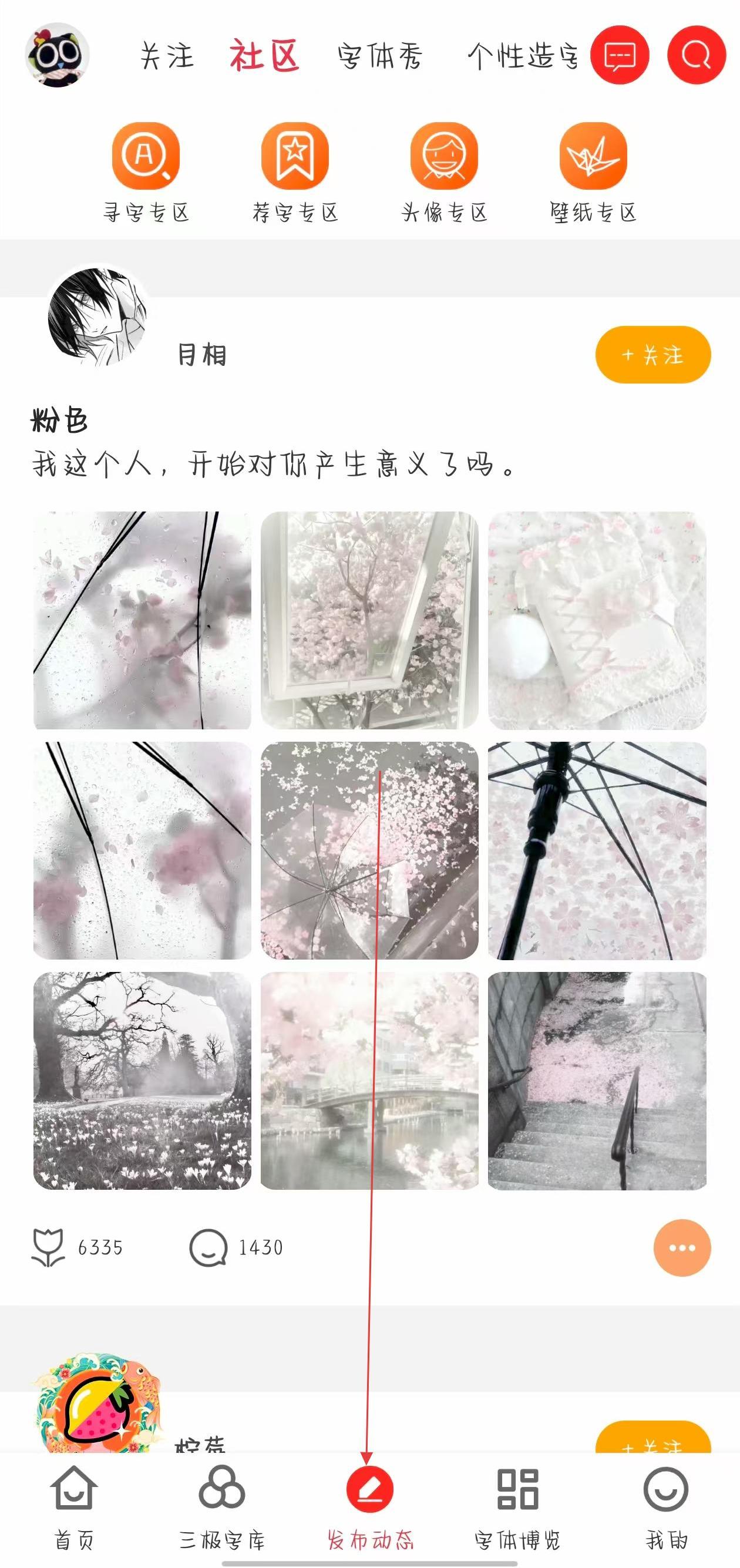 1、打开字体美化大师应用,进入底部导航栏中的社区页面,点击底部中间的发布动态按钮。