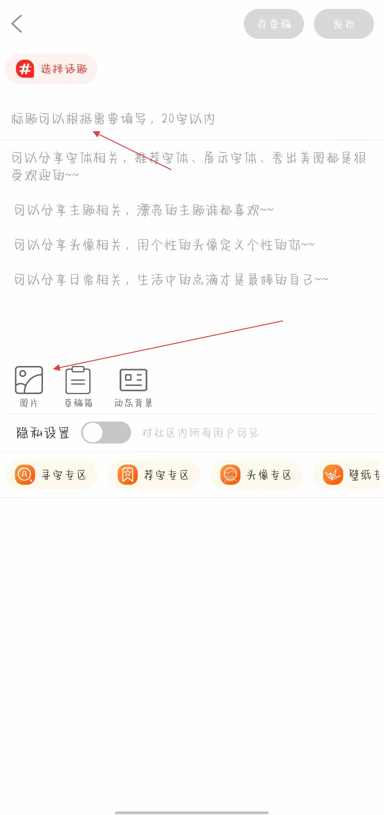 2、进入动态编辑页面,可在标题栏输入不超过20字的标题,在内容编辑区域输入想要分享的文字内容,还能点击图片按钮添加相关图片。
