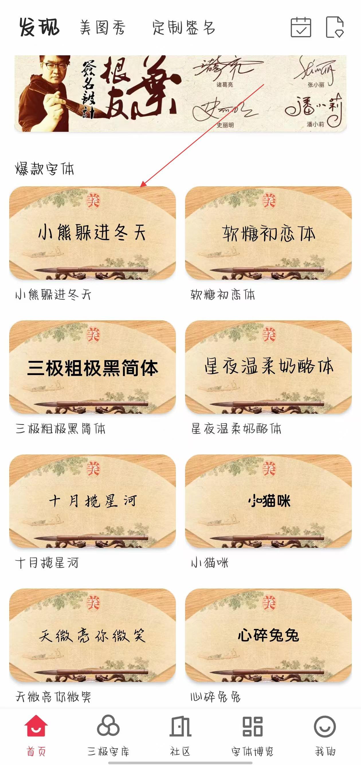 1、打开字体美化大师App,进入首页点击下方三极字库或者字体博览选项,在页面中浏览选择喜欢的字体,比如点击小熊躲进冬天字体。