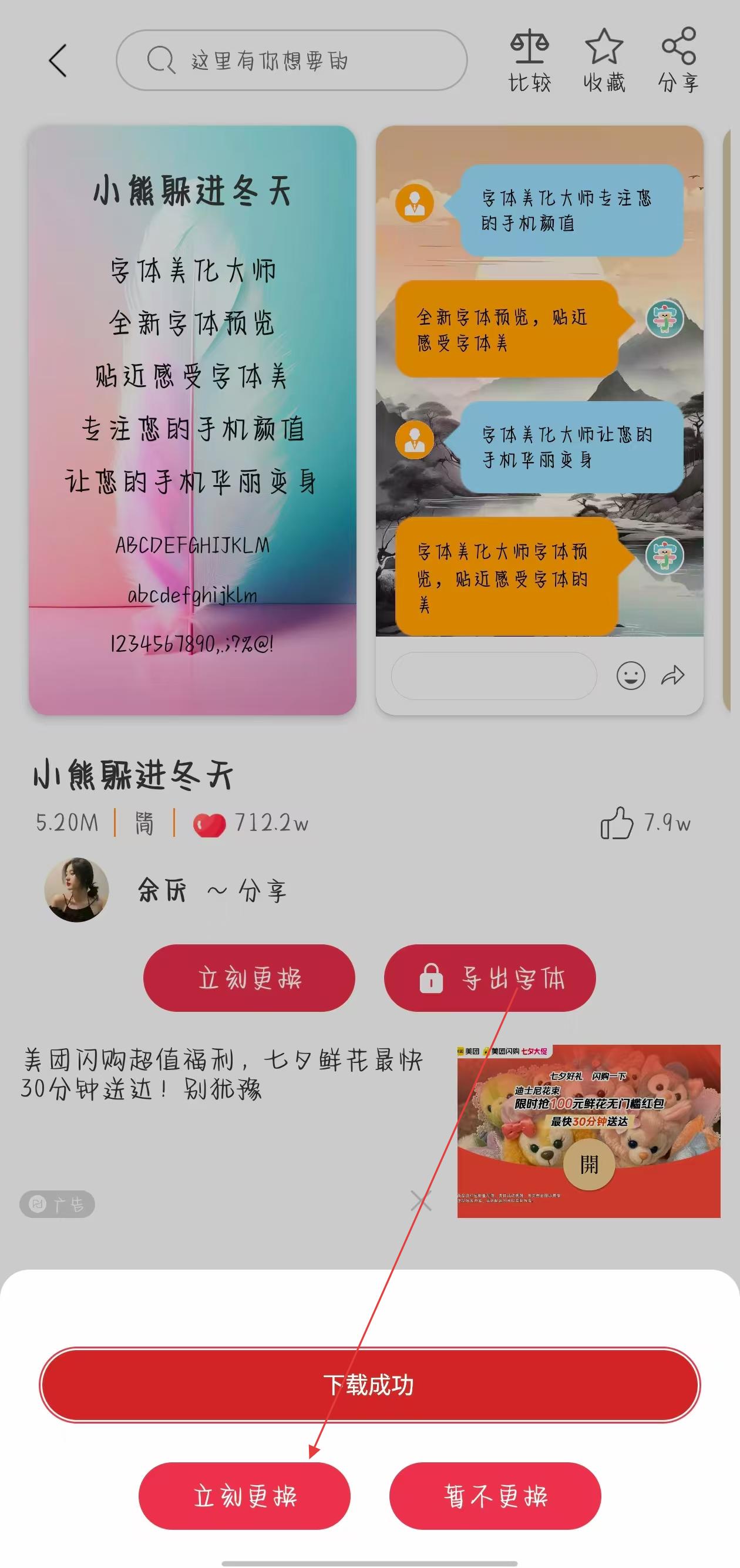 3、字体下载成功后,会出现立刻更换和暂不更换按钮,点击立刻更换,即可将手机当前字体更换为刚刚下载的字体。