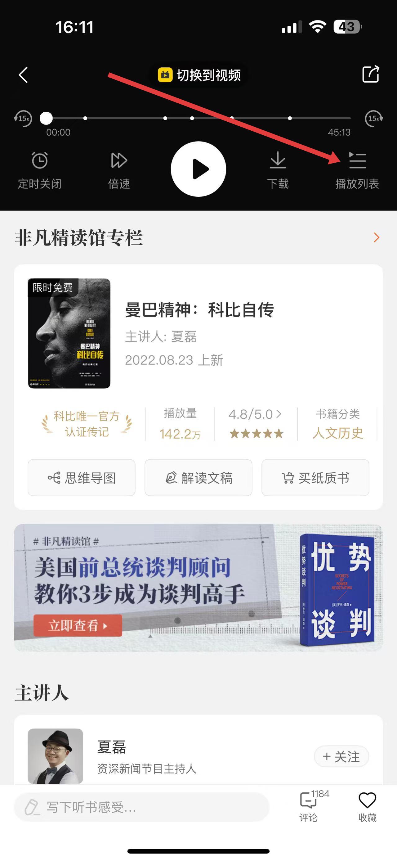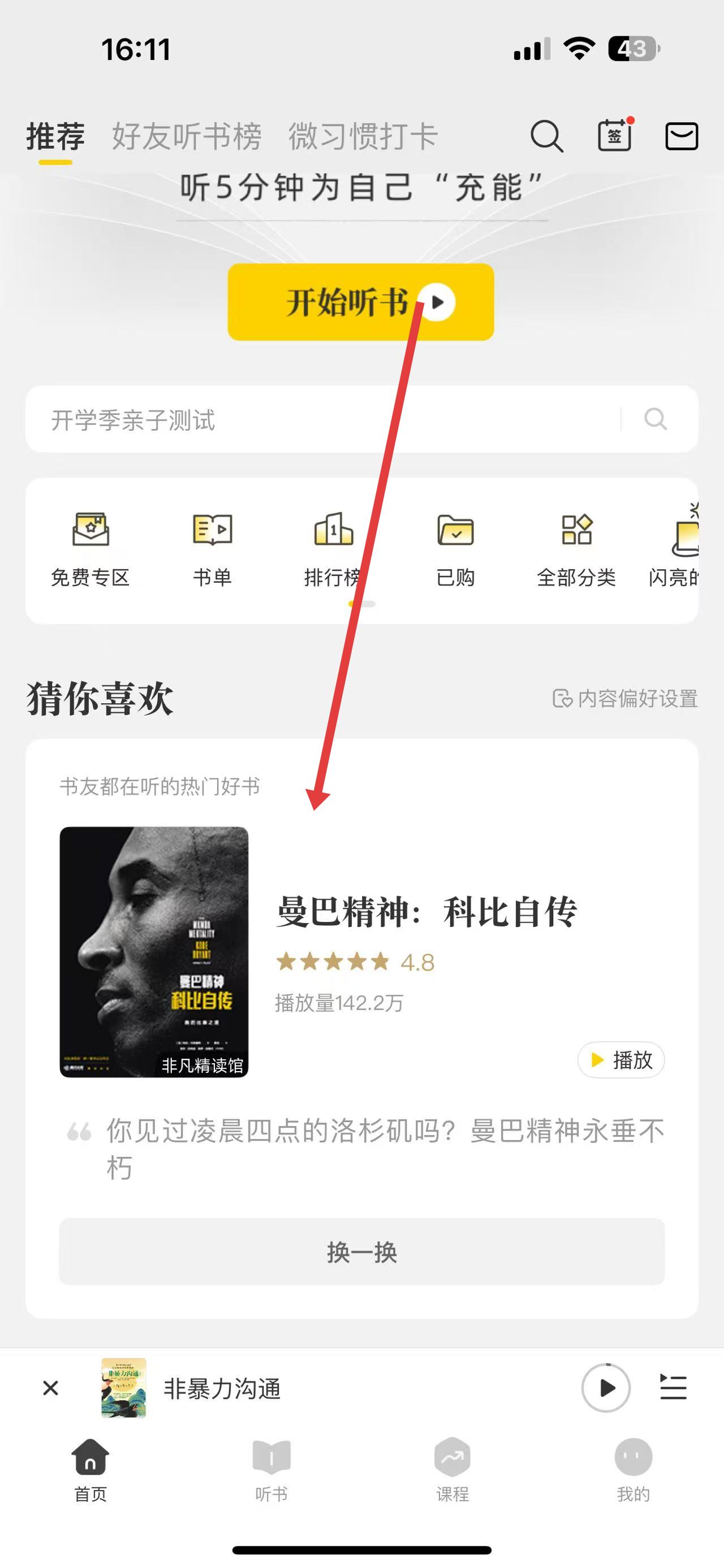 1、打开帆书APP,在首页猜你喜欢等区域选择一本要收听的书籍,如曼巴精神:科比自传,点击播放进入播放页面。