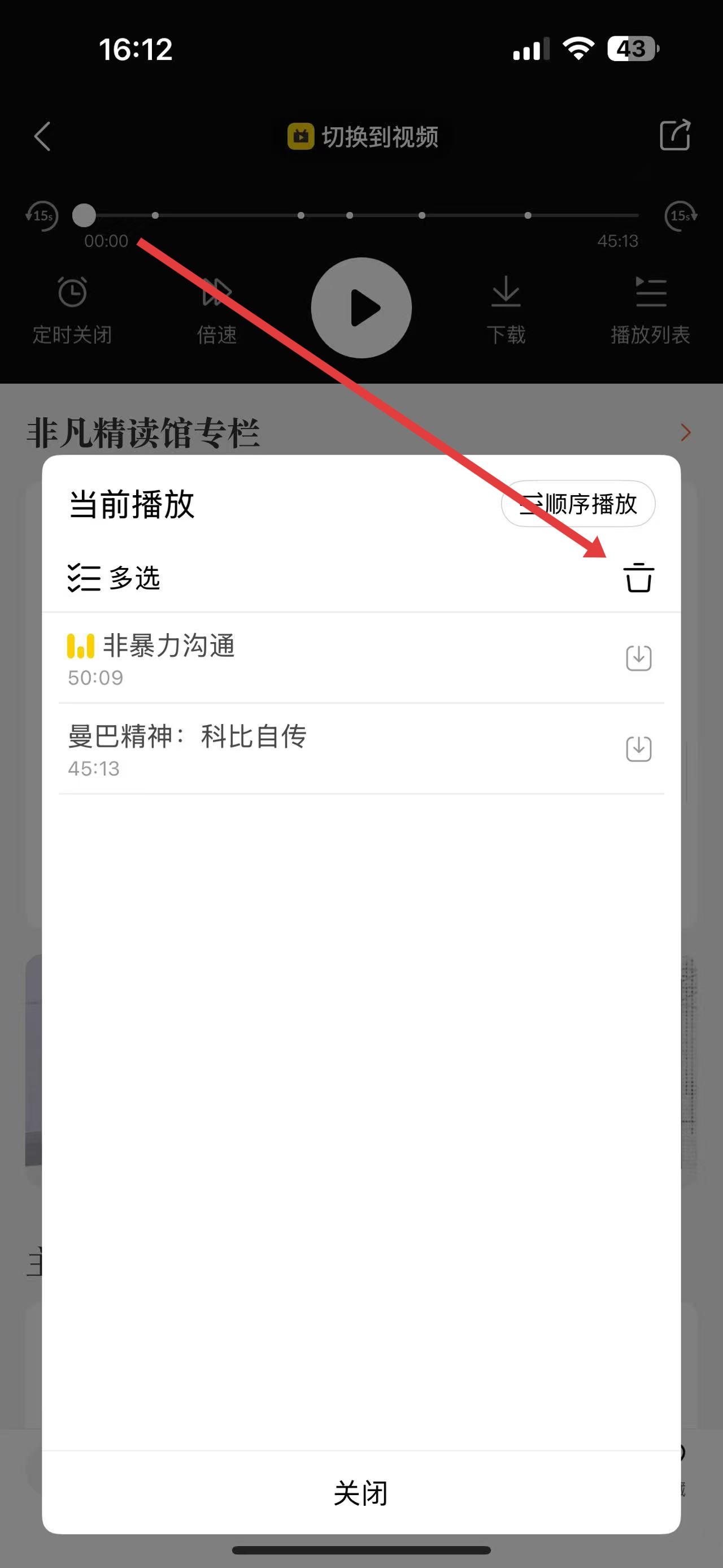 3、在播放列表界面中,找到想要删除的收听记录,点击对应记录右侧类似垃圾桶的删除图标,即可删除该收听记录。