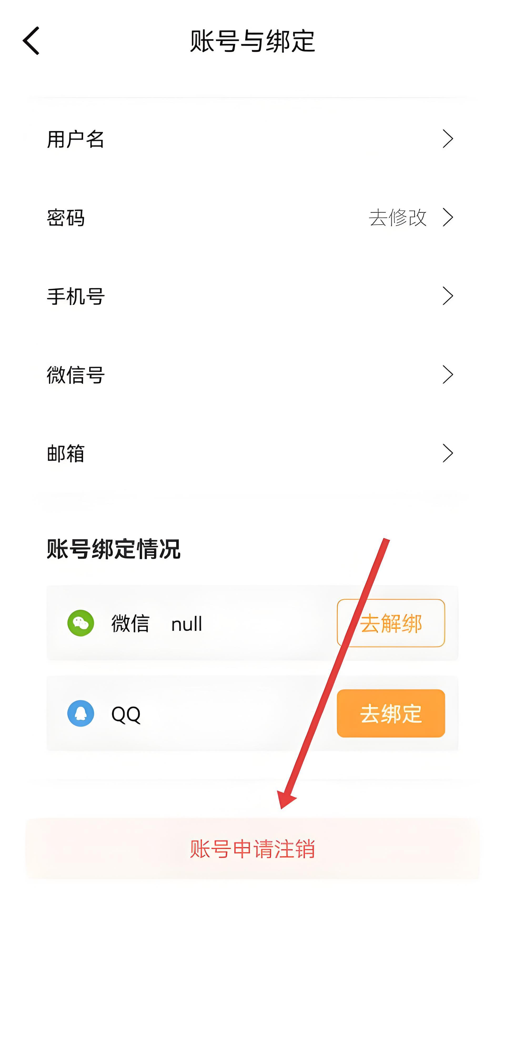 3、在账号与绑定的页面底部,点击账号申请注销按钮,后面按提示提交注销申请,完成账号注销流程。