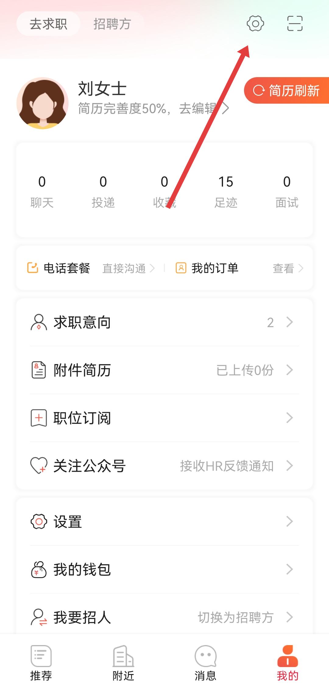 1、打开597直聘APP,进入我的页面,点击右上角齿轮状设置图标,进入设置的界面。