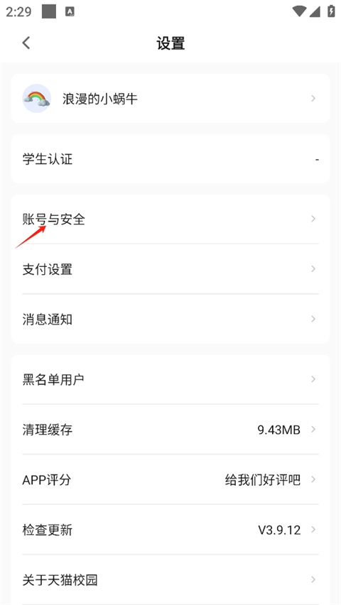 4、学生认证一般1小时内就可以审核通过,如果需要修改学生认证可以在淘宝app中按照如下操作进行在设置菜单中,找到并点击“账户与安全”选项