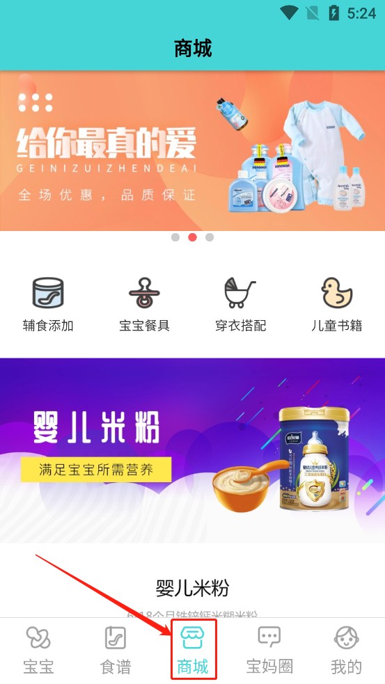 第一步:打开软件,点击“商城”(宝宝的辅食、辅食、书籍等也可以在该页面购买噢~)